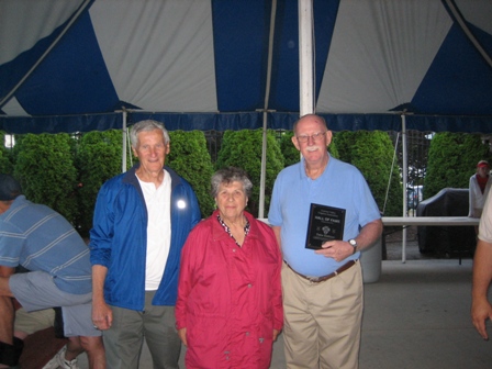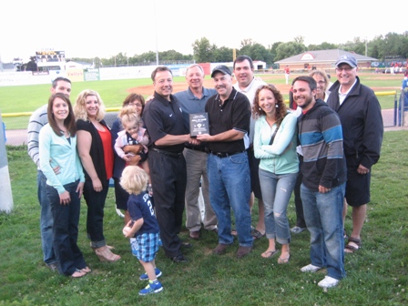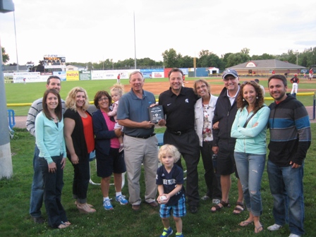 | Chichester family accepts the 2013 Induction Plaque from Vice President Newville | 2013 Inductee Deke Mattison and Guest his Art & Mary Bernecker of Softball Unlimited | 2013 Inductee Don Chichester's family photo at Dwyer Stadium |