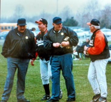 Baseball has been a family activity within the Riemer family for decades. Rogers over his 33 year career which concluded in 2003 was chosen to work 3 Section V Championship games played at the old Silver Stadium. Roger himself played in the 1955 sectional final at Silver Stadium and all three of his boys would also go on to play in Sectional Finals at Silver Stadium as well in their careers. His sons Rob (MCC), Tim (MCC) and Todd (GCC) all went on to play at the collegiate level. Both went on to be drafted Rob by the San Francisco Giants 1986 and Tim the Cleveland Indians in 1989 where he would play in the NY-Penn League with Watertown. Roger would go on to join Tim who coached Newark Bandits of the North Atlantic League as an assistant coach. Roger has been married to his wife Valerie for 51 years. They have three sons Rob, Tim, Todd as well as 4 grandson and 2 granddaughters. Photo - Plate Conference at Lyndonville with Don Grabowski and Coaches John Hayes & Mark Hughes |
