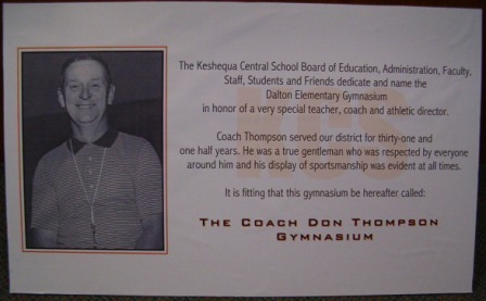 Don’s connection to Section V Athletics and Keshequa High School dates back to his high school playing days when he was a standout three sport athlete in baseball, soccer and basketball. Don went onto attend SUNY Brockport (’51) as a two sports athlete in soccer and baseball as well as earning his degree in Health and Physical Education. After three years as a US Army Staff Sergeant (52-54) he returned to Nunda where he would teach PE, coach baseball, soccer, basketball as well as serve as Athletic Director and would retire from Keshequa in 1986. Don played an active roll in the Nunda community including his 50+ year service in organizations like: Nunda Station Masonic Lodge #682, VFW Post# 8961, Nunda Fire Department, Inc, Nunda Rotary Club, Nunda Volunteer Ambulance Service. Other accolades include a 1996 inducted into the SUNY Brockport Athletics “Hall of Fame”, and the 2002 Nunda Senior Citizen of the Year. In 2004 the Keshequa School Board dedicated (Gym Photo) the Dalton Gymnasium in Donald’s name. |