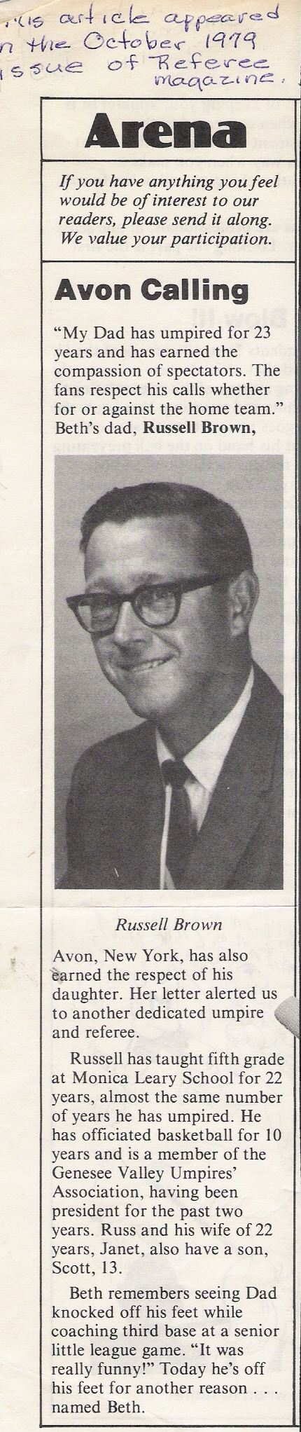 go on to be a member of the GVUA for almost 40 year, "Moocher" like his fellow Hall of fame member and brother Russ was a native of Avon, NY graduating in 1950. He had a wonderful love for the game and was well respected by his fellow umpires and coaches alike. "Moocher" would retire after his umpiring career and move to Avon, Florida. "Moocher's" enjoyed his time in Florida and was an active softball player. His untimely death in 1995 would occur on the ball diamond during a softball game after he had crossed home plate from hitting a home run. As story would have it he would have not had it happen any other way. |