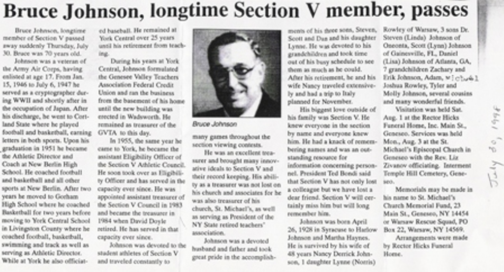 Bruce Johnson served as one of the founding fathers of the Genesee Valley Umpires Association. During his time with the GVUA he served as the Association Secretary/Treasurer from 1966-1973. Bruce was a veteran of the Army Air Corps during WWII and the post war occupation of Japan. Upon returning home he enrolled in Cortland State University (class of 51) where he lettered in football and basketball. In 1955 Bruce moved to York Central School where he served as Athletic Director as well as coaching football, basketball, swimming and track. He also served as the Section V Eligibility Officer and Treasurer of the Section V Executive Council. Bruce passed away on July 30, 1998 and was survived by his wife Nancy of 48 years. Bruce and Nancy were very proud of their three sons (Steven, Scott, and Dan) as well as their daughter Lynne. |